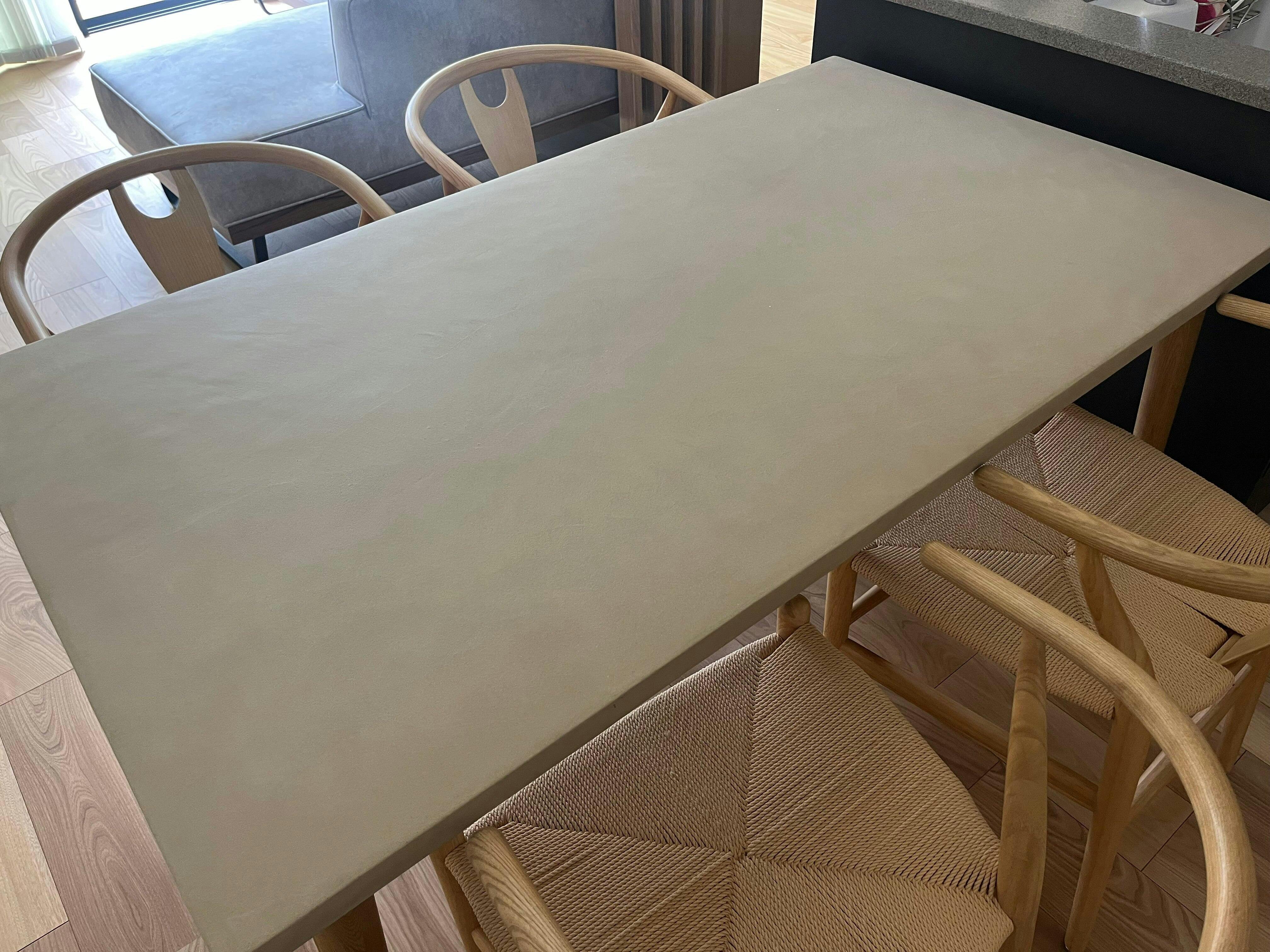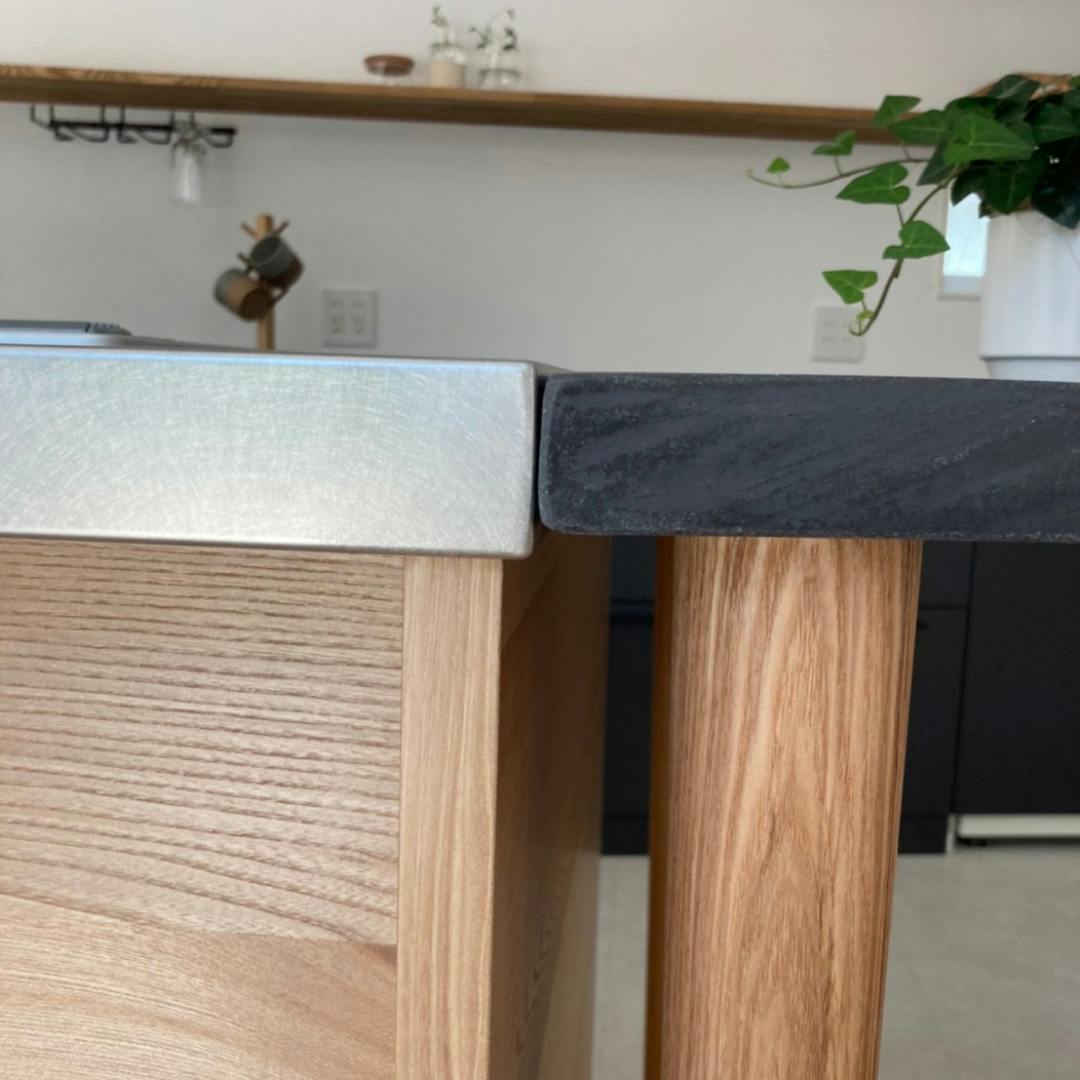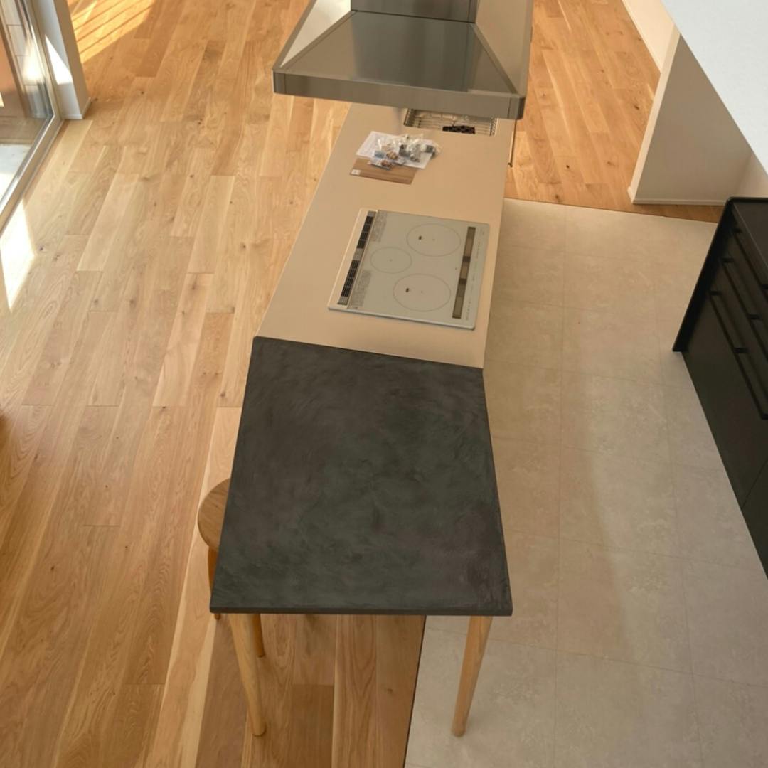 天板は、有名ブランドの空間づくりも手がける左官職人が一点ずつ丁寧に塗り重ねています。光の差し込み方や角度によって表情が変化し、深みのある質感を生み出します。