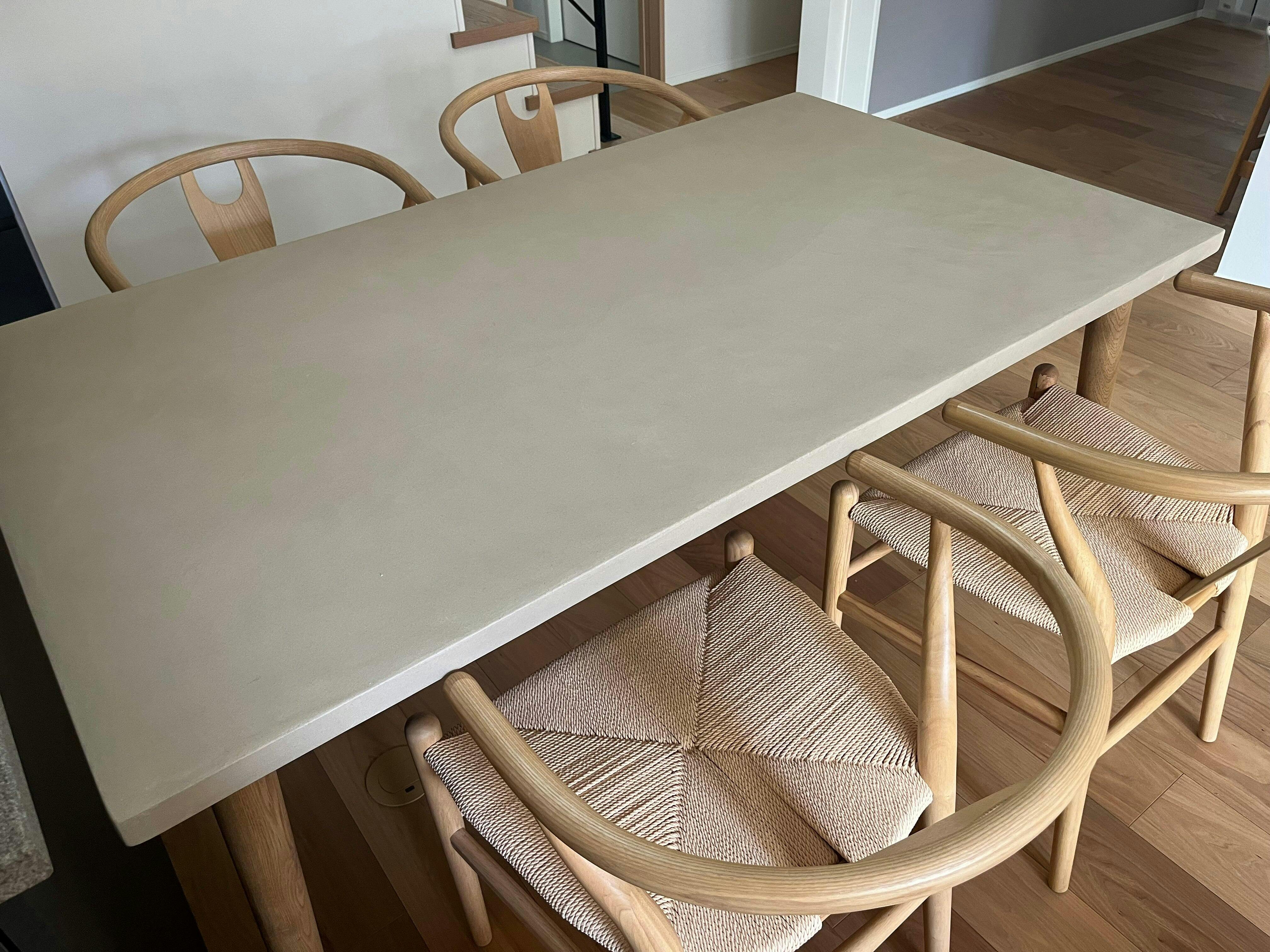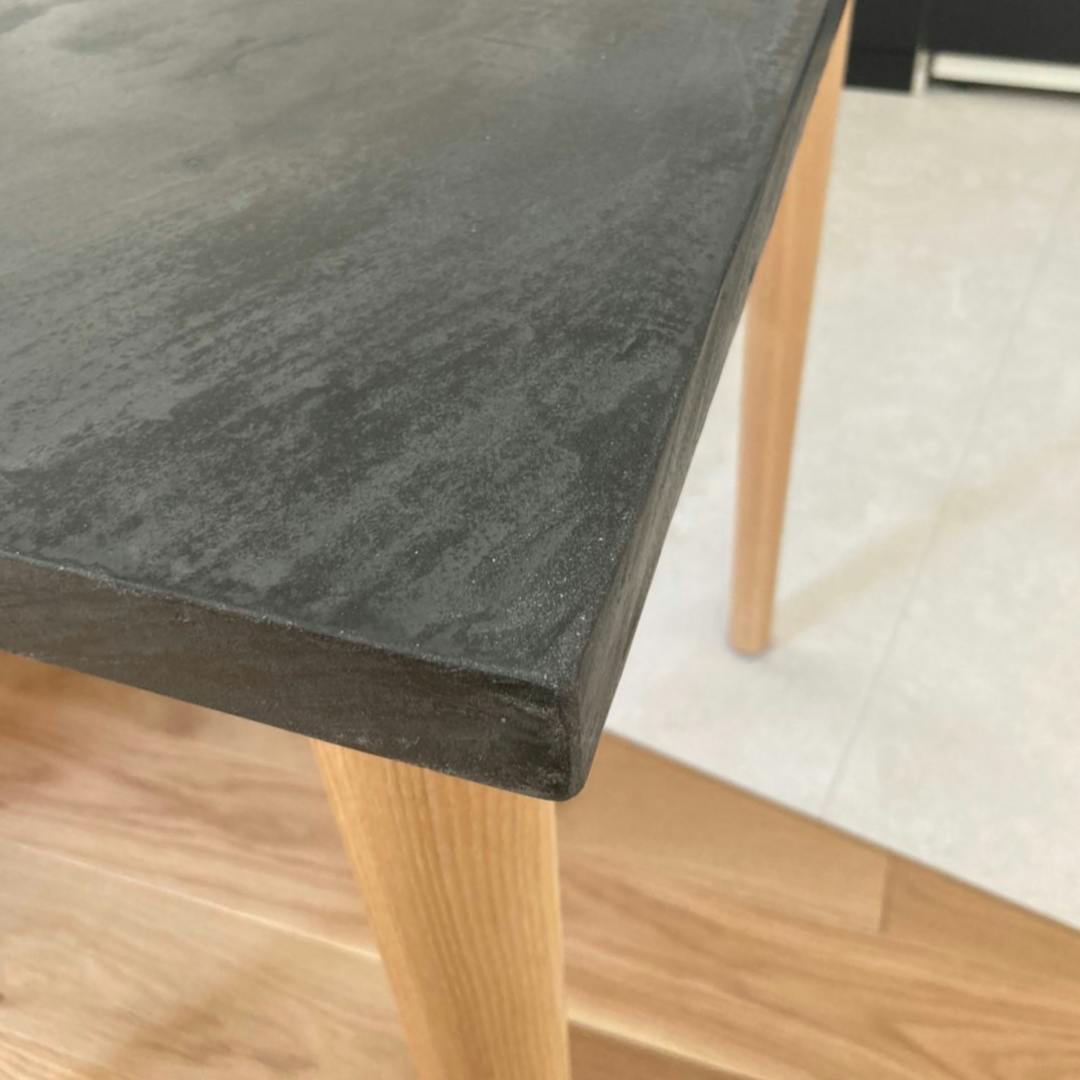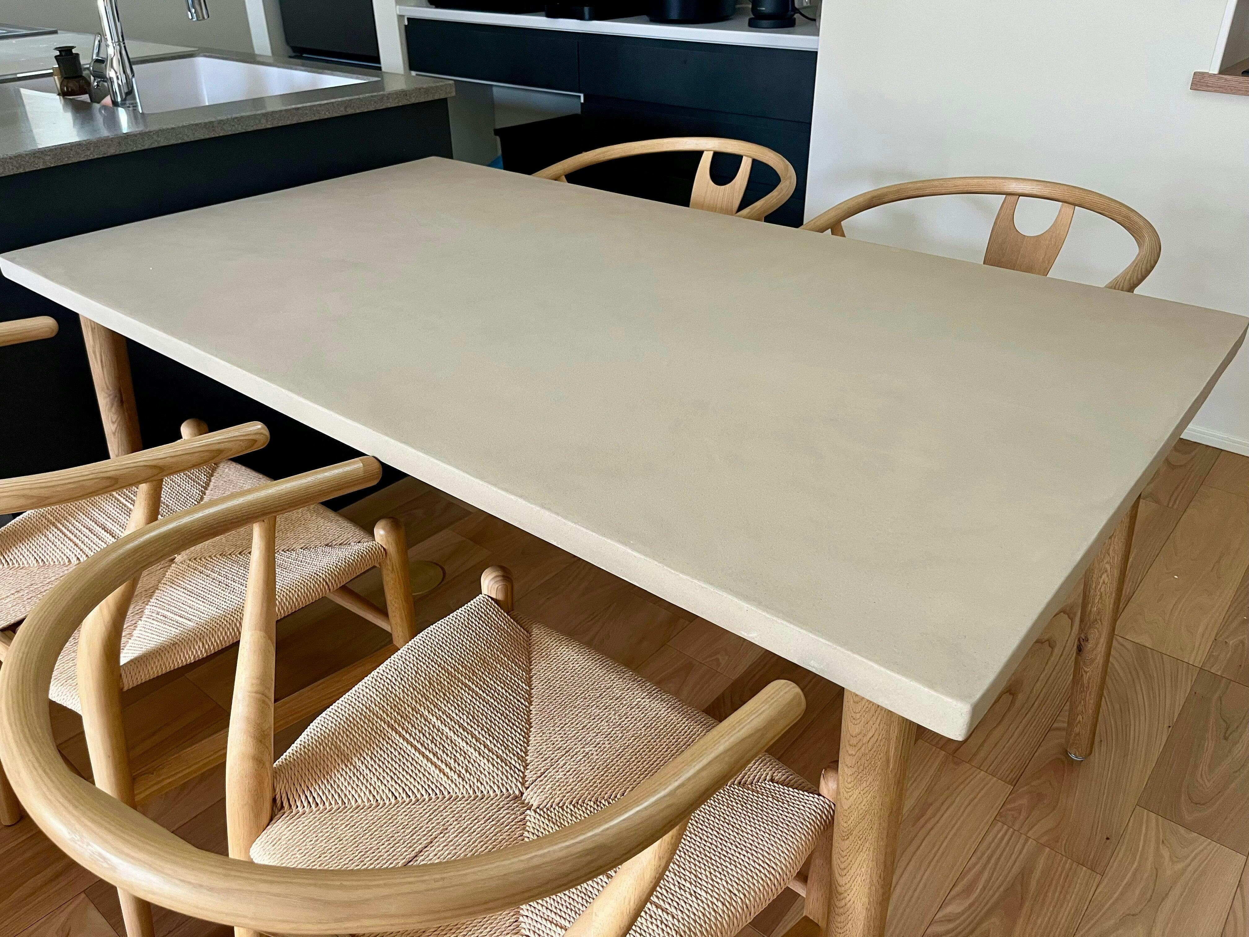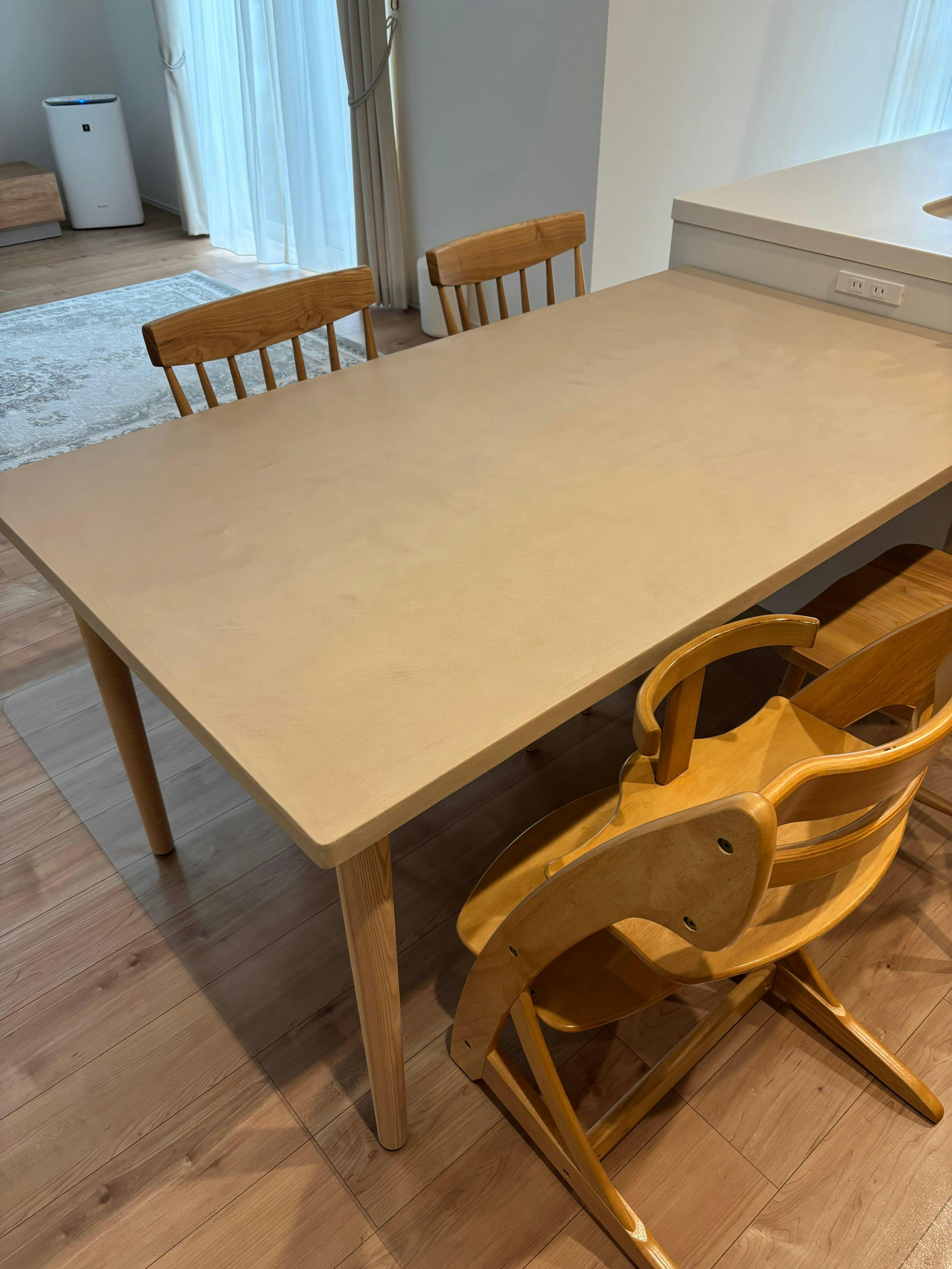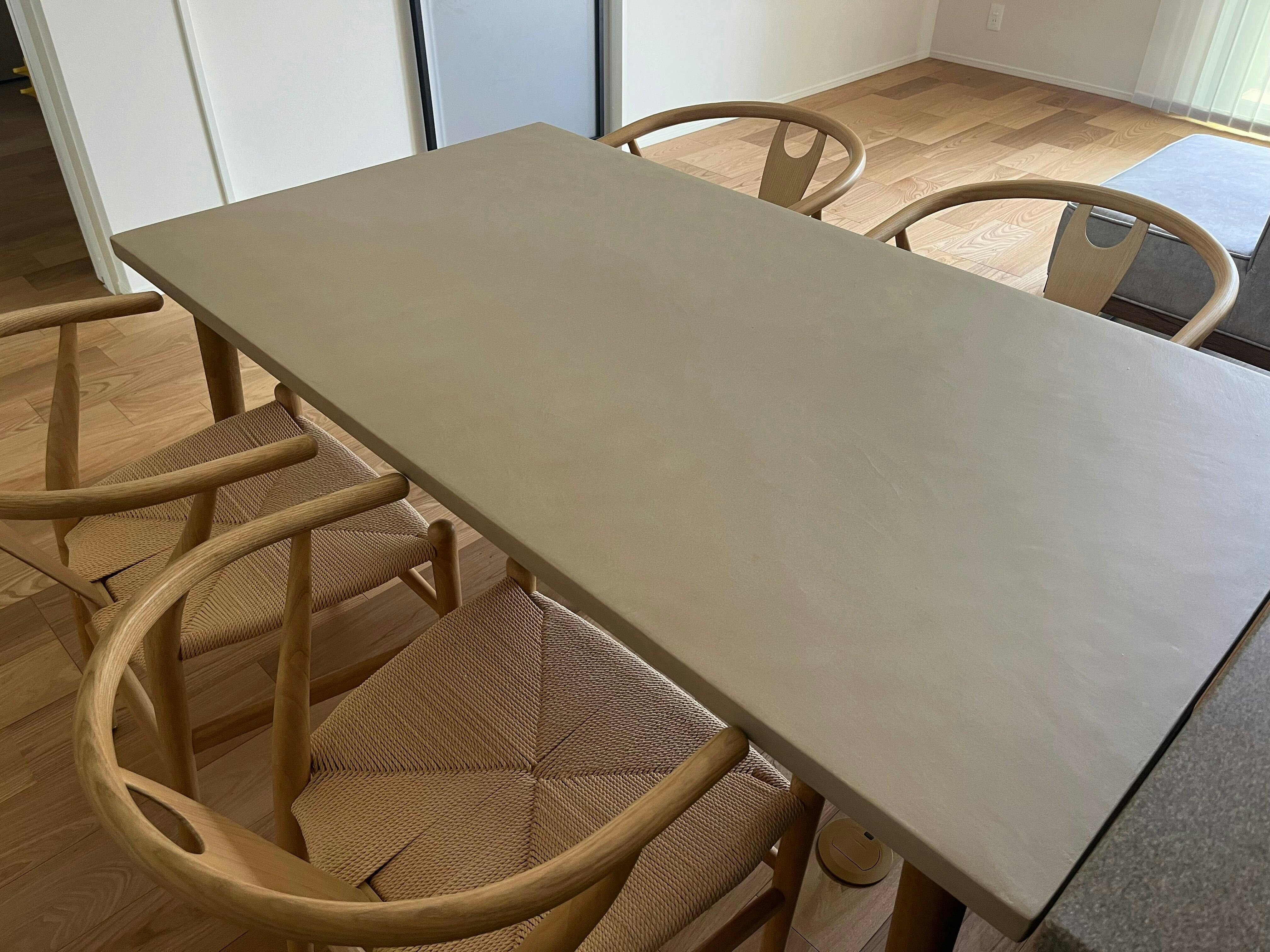 熟練の職人技が光る、モールテックス仕上げの天板とタモ無垢材の脚が美しく調和したダイニングテーブル。