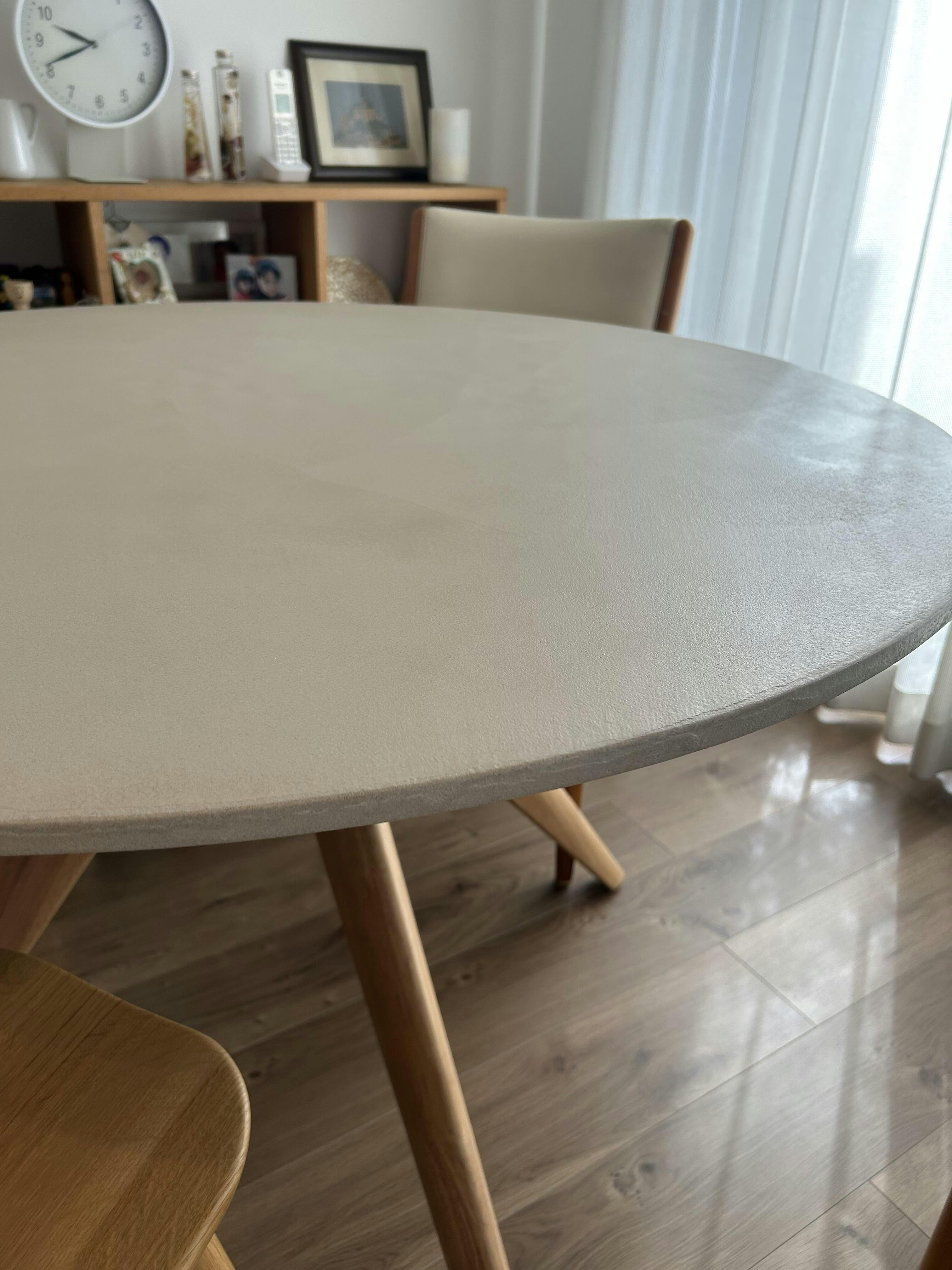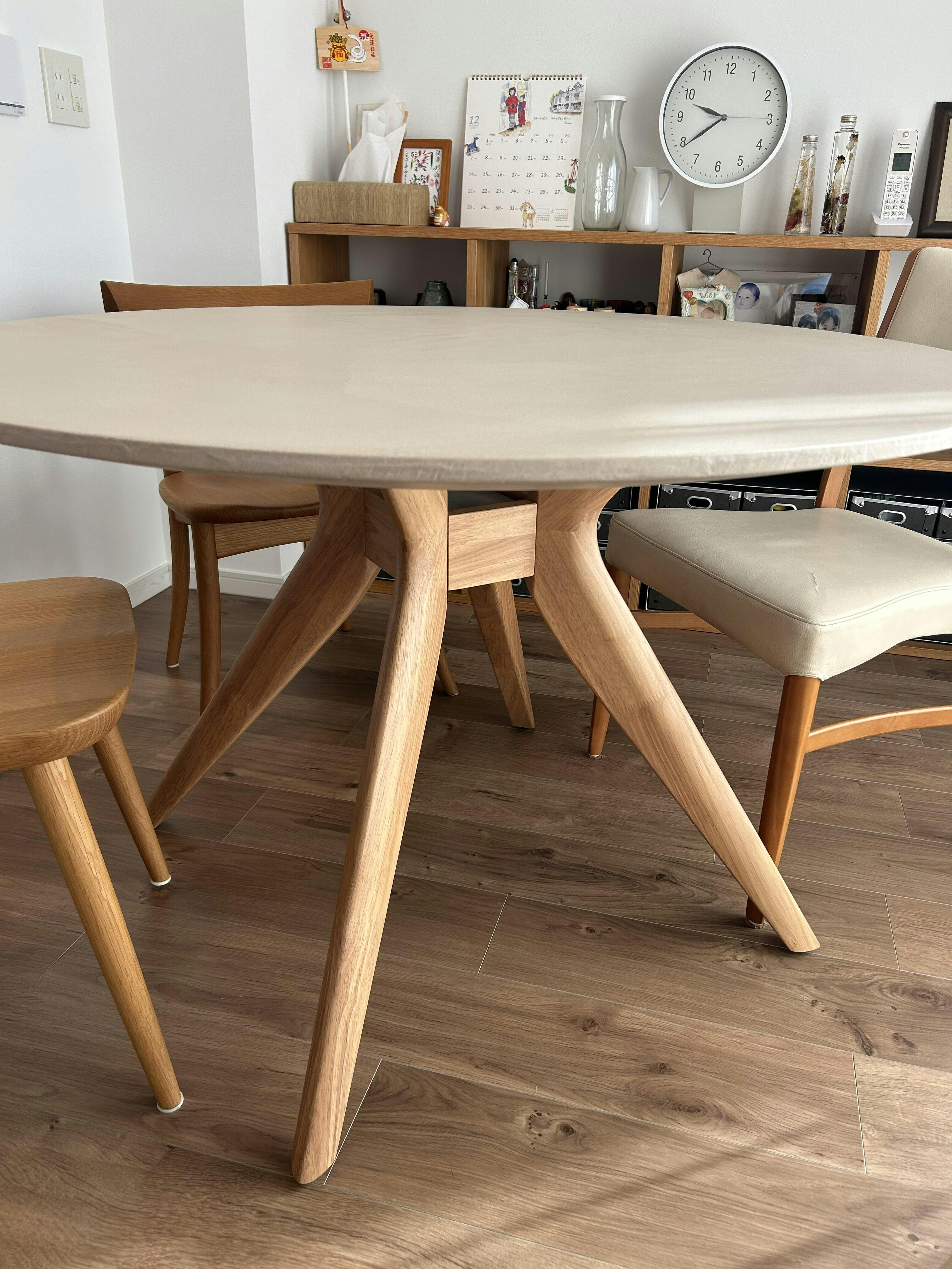 自宅リフォームにあたり、ラウンドテーブルを探していてモールテックスに出会いました。 サンプルを3色届けていただき、そのほっこりした風合いに一目惚れ。 直接店頭で見られないことが気になりましたが、不安なことは担当の方がLINEで丁寧に説明して下さり、安心して購入することができました。 テーブルが届き、部屋に配置すると一気に素敵な空間に!帰宅するのが毎日楽しみになりました。 お手入れも思ったより手軽でした。大切に使っていきたいと思います。 購入までたくさんの質問に答えていただき、配送も丁寧で、良いお買い物ができました。ありがとうございました。
