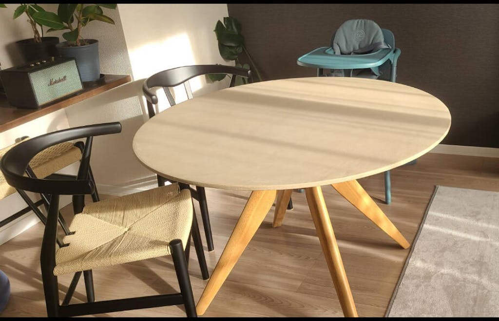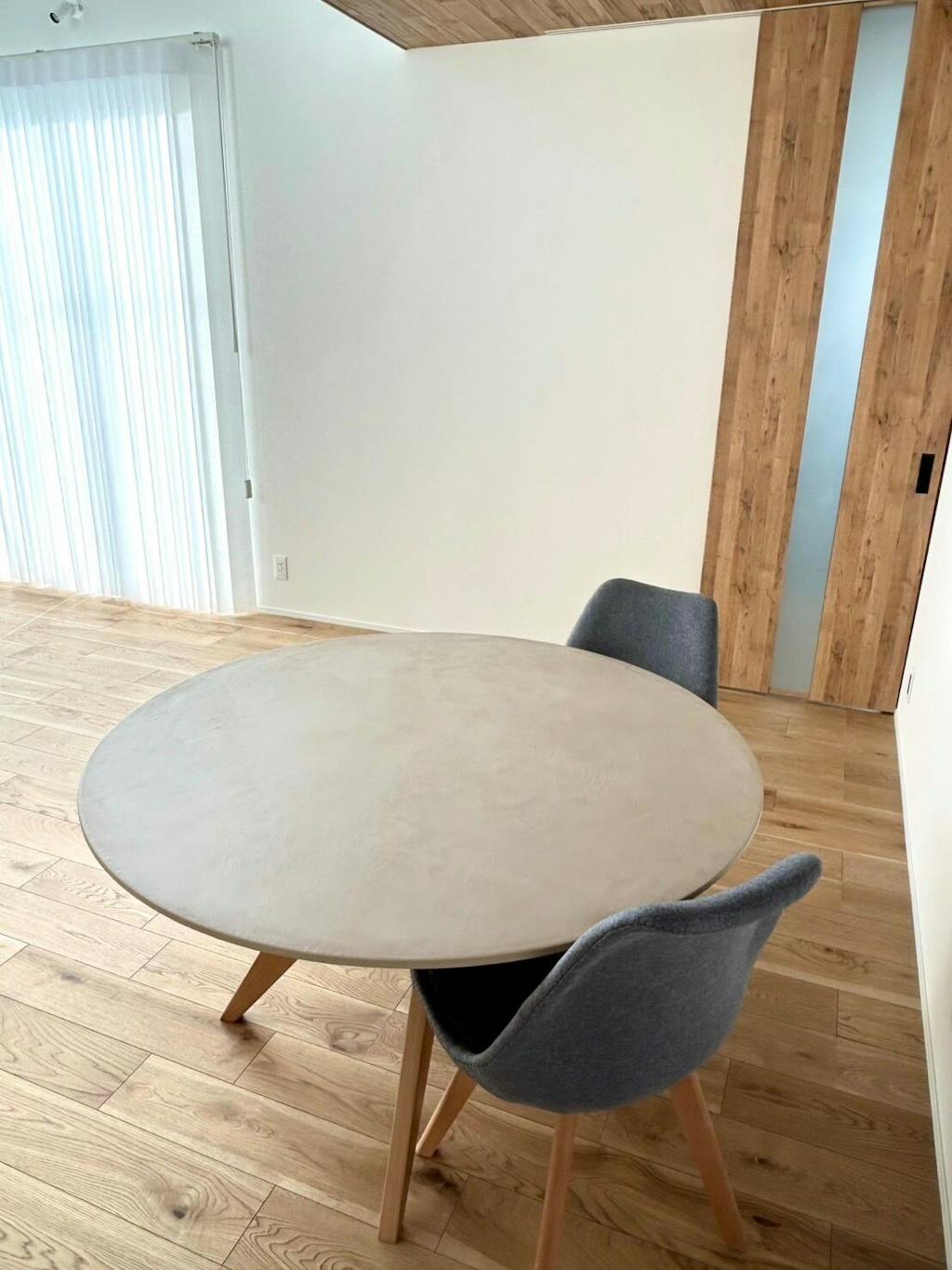 円形なので圧迫感がなく、ダイニングが広く見えるのが良い点です。天板はマットな質感で安っぽさがなく、指紋や汚れも目立ちにくいです。