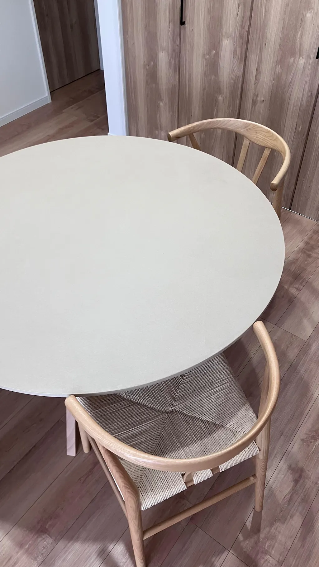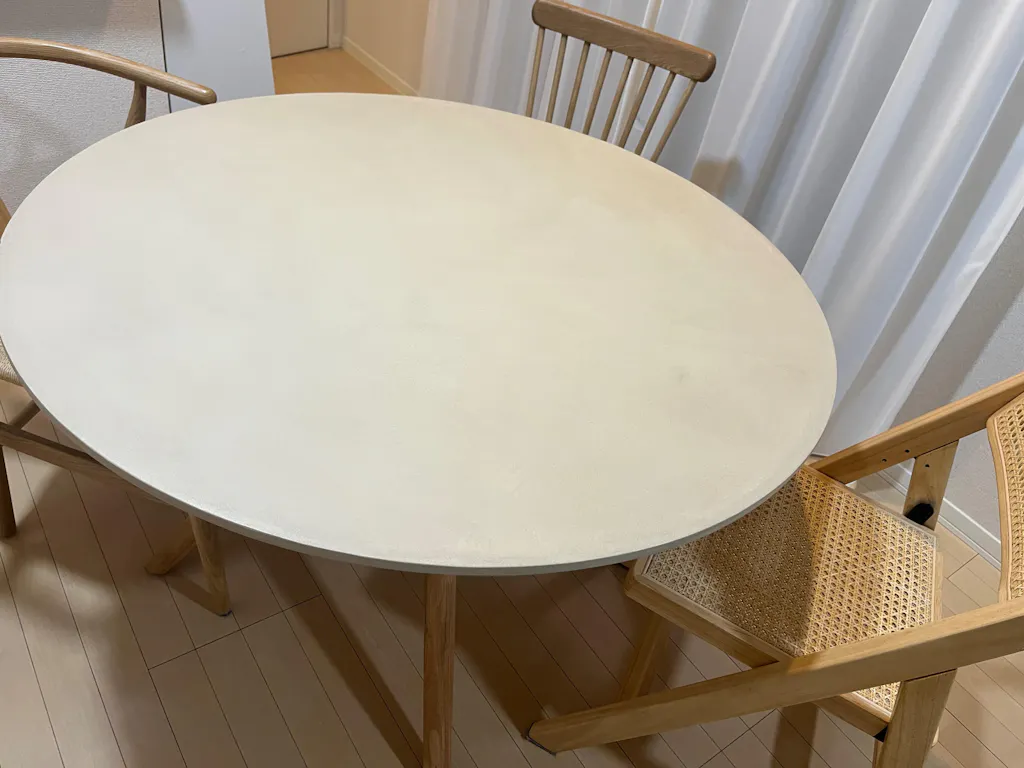 シート材のテーブルだと安っぽい、無垢材だと汚れが心配、質感が素敵で長く使える素材はないかな…と探していて、モールテックスに辿り着きました。職人さんの手作りなので手塗りの温かみがあり、無垢の木製チェアともすごくマッチして大満足です!