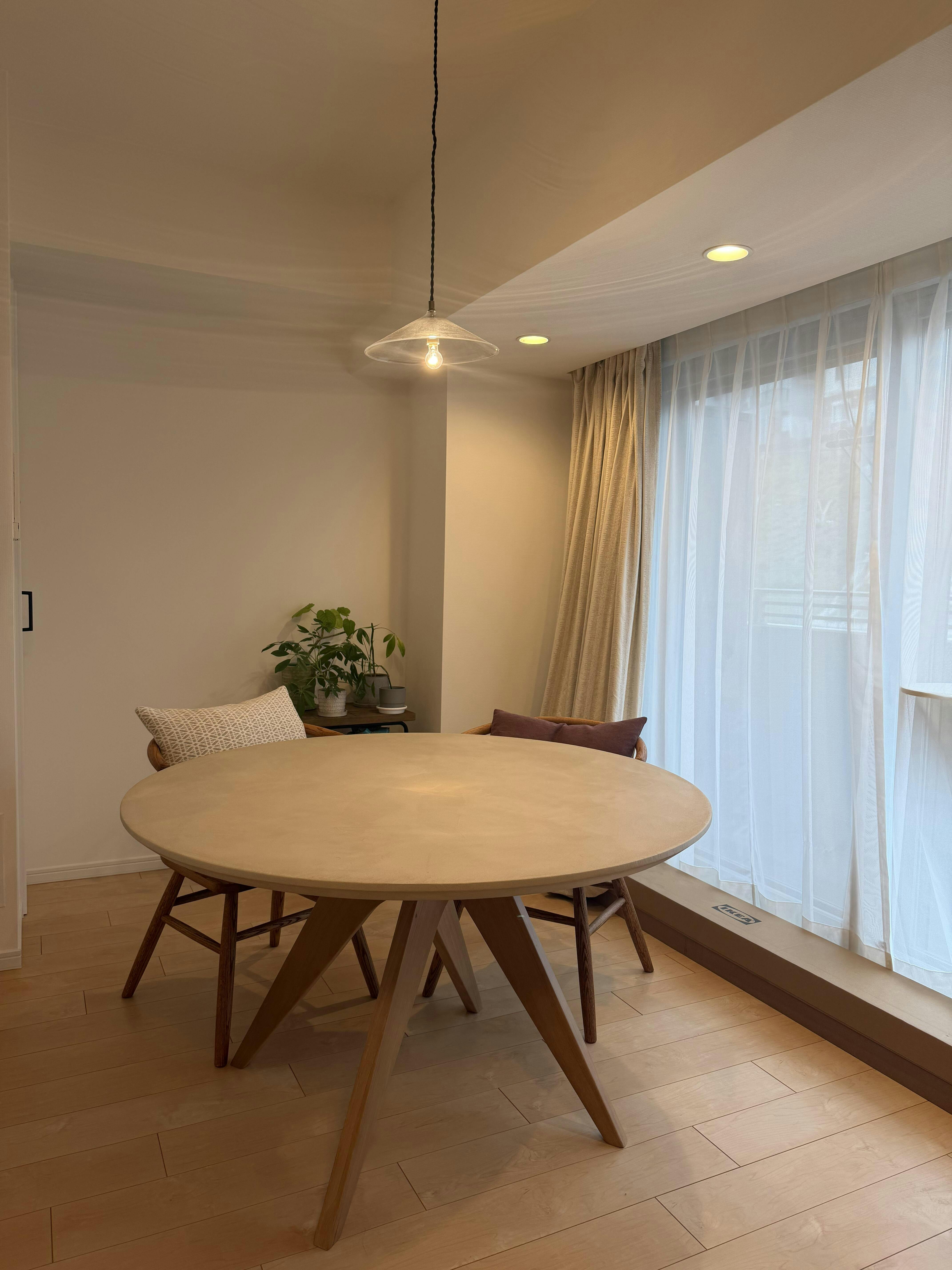 脚部には、温もりを感じる無垢材を使用。交差するように配置された構造が視覚的なアクセントとなり、空間に動きを与えます。直径1200mmの丸型テーブルは、4人でゆったりと囲えるサイズ感。角がないため、小さなお子様がいるご家庭でも安心してお使い頂けます。